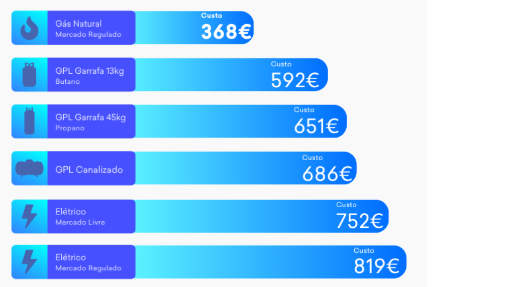 - Já se a mesma quantidade de energia for consumida em eletricidade, o custo sobe para cerca de 819 € por ano, de acordo com os preços praticados pelos principais comercializadores.